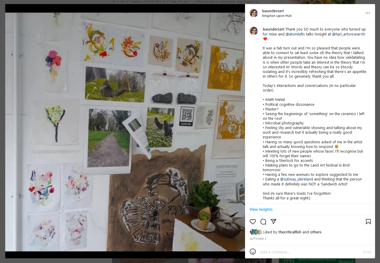 The big thing for August however, was having my work up at the Hull Artist Research Initiative in what I called the Land Empathy Development Lab – the context and my intentions of which can be found HERE. During this time, I also facilitated a CRAG session based on the ideas of my work, and had a Monday Musings (led by the fab Alex Stubbs) on my work too – which I found insightful and helpful). I wrote a reflection on the entire experience later on, which can be found HERE. It was a great experience all in all, and I learnt a lot from it.