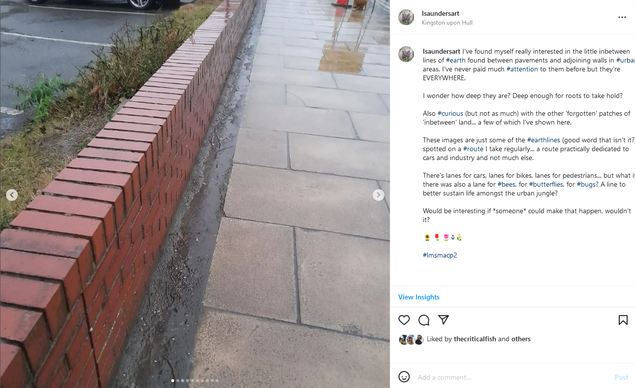 | Not only does site-specific art alter how audiences perceive and engage with the space it occupies (Taïeb, 2020), but also, through interpretation, demands that the reader/viewer embody an alternative perspective (Blaeser, 2020). | As above, plus installing a living sculpture on the Hull Samaritans site (conversations in progress) |