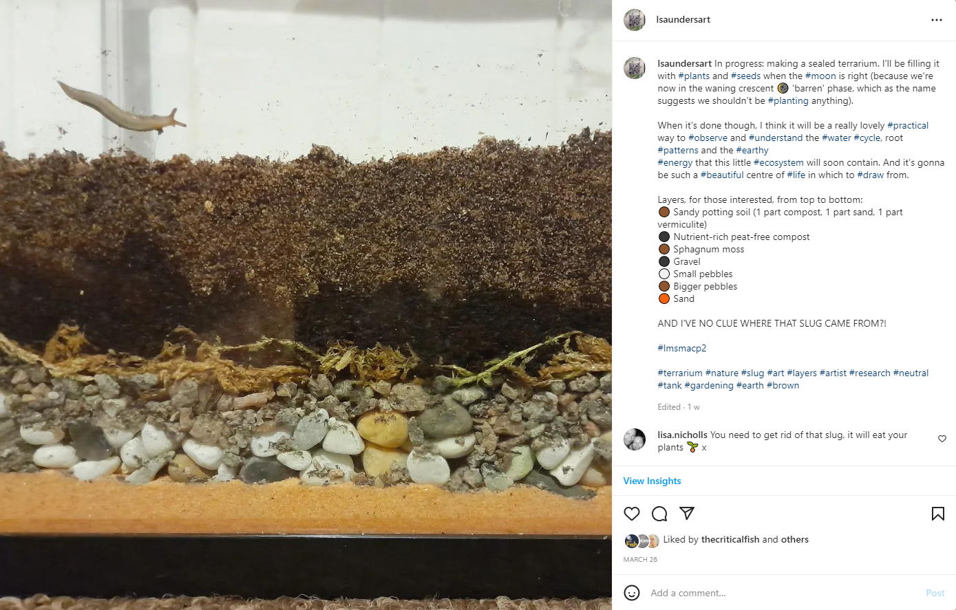| Wilson (1984, cited in Taylor, 2021, p.36) described art as a tool for discovery and artists as ‘expert observers’, both of which are able to instruct society through aesthetical ‘pleasing’. | Gardening, drawing, meditation… and sharing my practice through social media, blogging, and word of mouth.