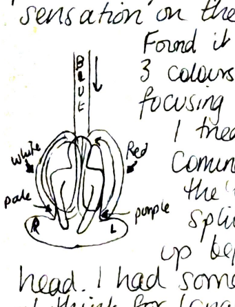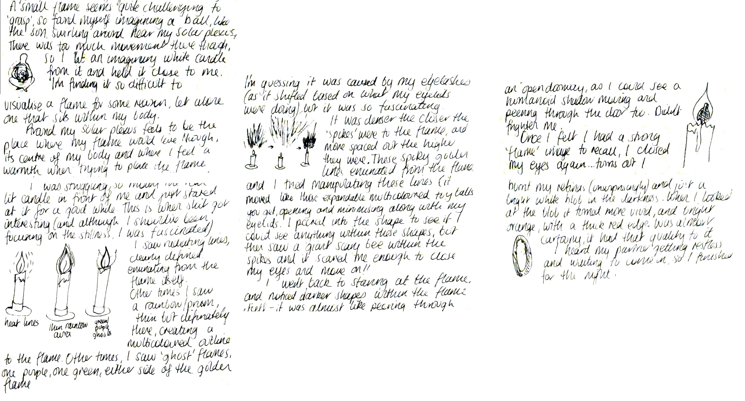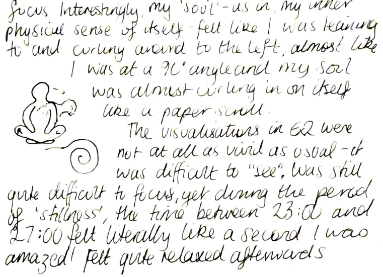 | Whitehead (1929, cited by Sjöstedt-H, 2016) suggests a panexperientialist philosophy of organism, in which perception is shared by both object and viewer in a synthetisation of mind and matter. Although Western science rejects such anthropomorphism on grounds of epistemological humility (Taylor, 2021), Caracciolo (2014, cited in Ryan, 2020, p.112) counters consciousness-attribution with consciousness-enactment, suggesting that subjects (e.g. a rock, animal, plant, landscape) can communicate in the first person by granting the reader access to its mind. Similarly, Abrams (1997) explains how the mind is understood by the Navajo people as a participatory wind as opposed to a personal possession. Therefore, all elements within an inhabited ecosystem contribute to a state of mind, which in turn, is the source of shamanistic/sorcerer gifts. | Meditation and free writing:drawing These practices encourage a shift in thinking, and spiritual:intellectual communication with the non-human. |