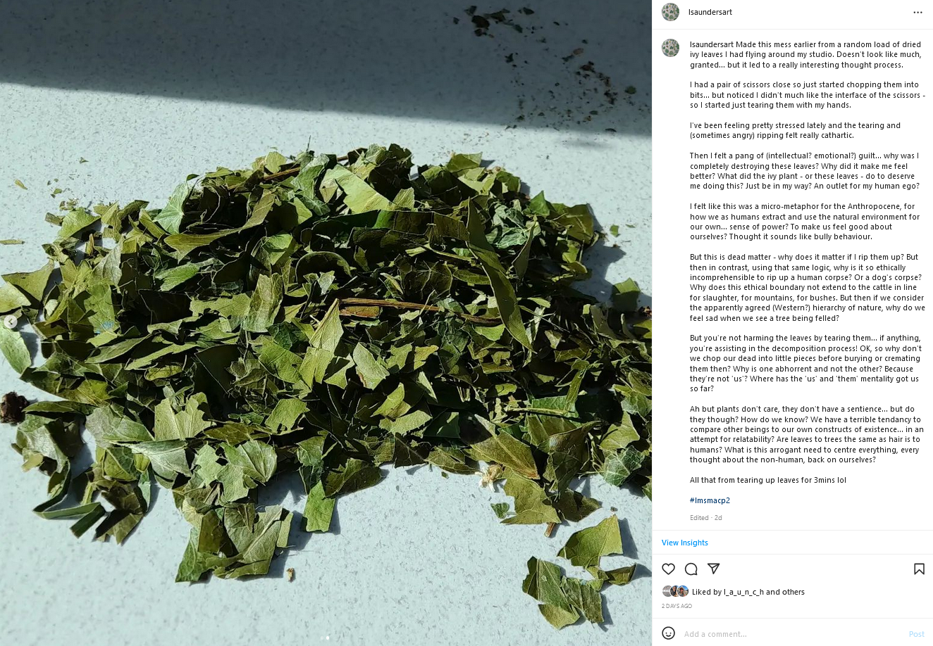 This post was originally published 8.4.2022 but I will update as I go to it to include newer explorations, up until my module hand-in date (mid-May). I have drawn attention to practical work that I feel best reflects the theme – most of this is recent, but due to the seasonality/long term nature of my practice I have also included images from last year that either illustrates ongoing practices or demonstrate how co-creations I’m starting now are ‘expected to be’ later in the year. I have also included a new coding system, which will further help connect theory to practice.