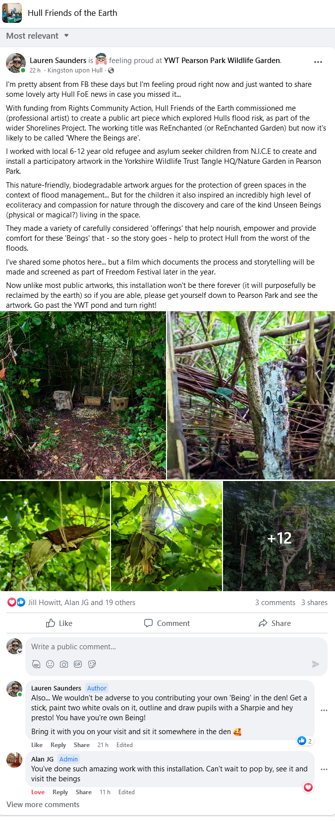 This has largely been about dissemination (e.g. workshops, blog posting), improving ecoliteracy/environmental care/nature connectedness with communities (e.g. projects, exhibition, public programme) and supporting local environmental charities. It has also been about making work which can have a positive environmental impact (i.e. the seed ball, the Where the Beings Are installation), making conscious eco-beneficial/accessible decisions in regards to my professional practice, and instigating local environmental action groups (e.g. Culture Declares Emergency Hull).