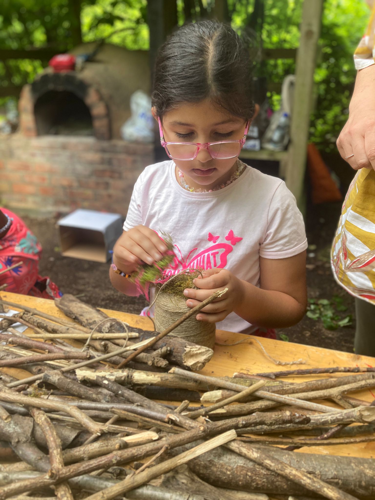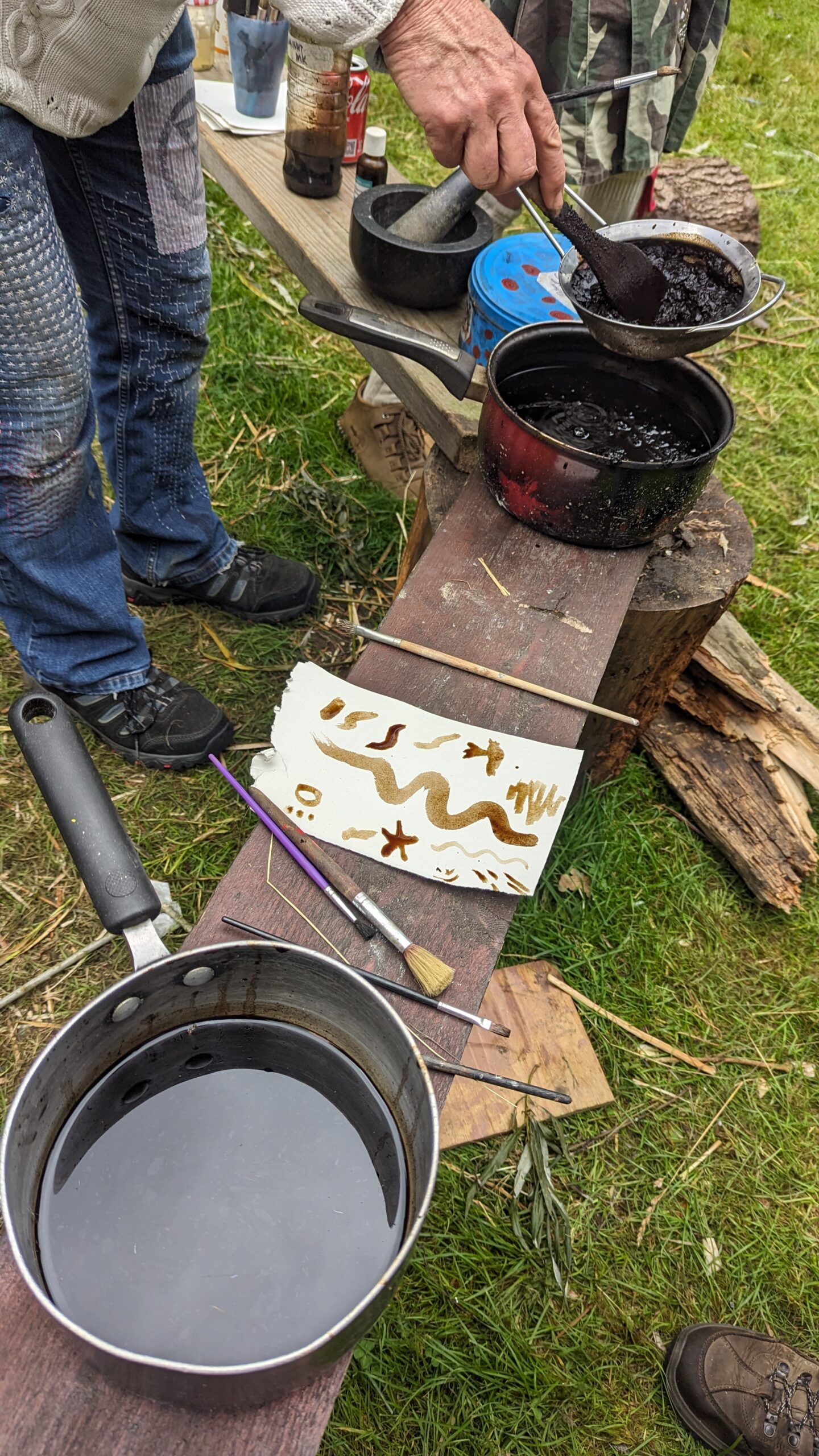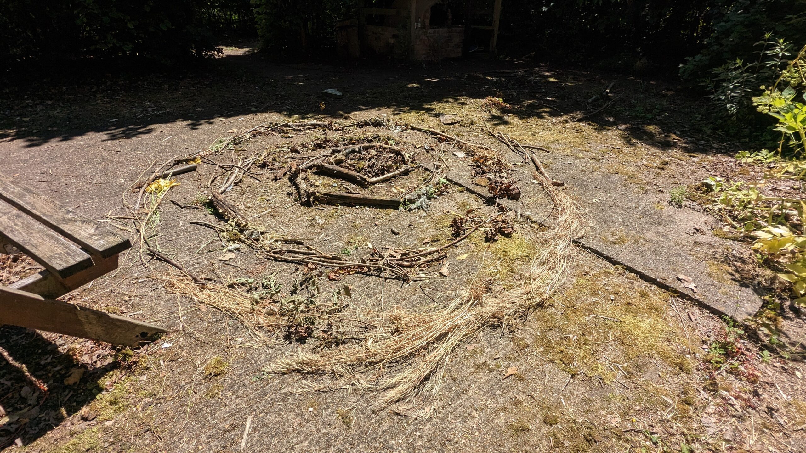 | Dewey (1934, cited in McWilliam, 2008, p.32) argues that aesthetic beauty emerges from the relationship between individual and object, in what he calls ‘the experience’. The senses – of which touch is the most dominant for artists (Eames, 2008) – are the keys to experiencing the ‘landscape from within’ (Jokela, 2008). | Making using natural materials, drawing, doing, foraging, sitting… and encouraging workshop participants to do so with me. |