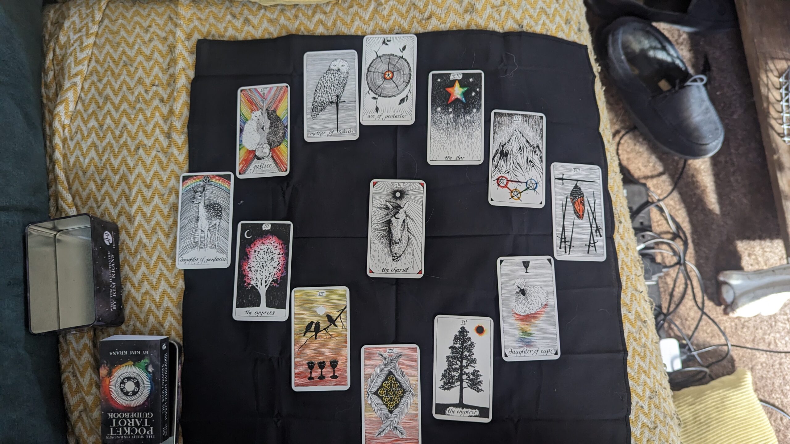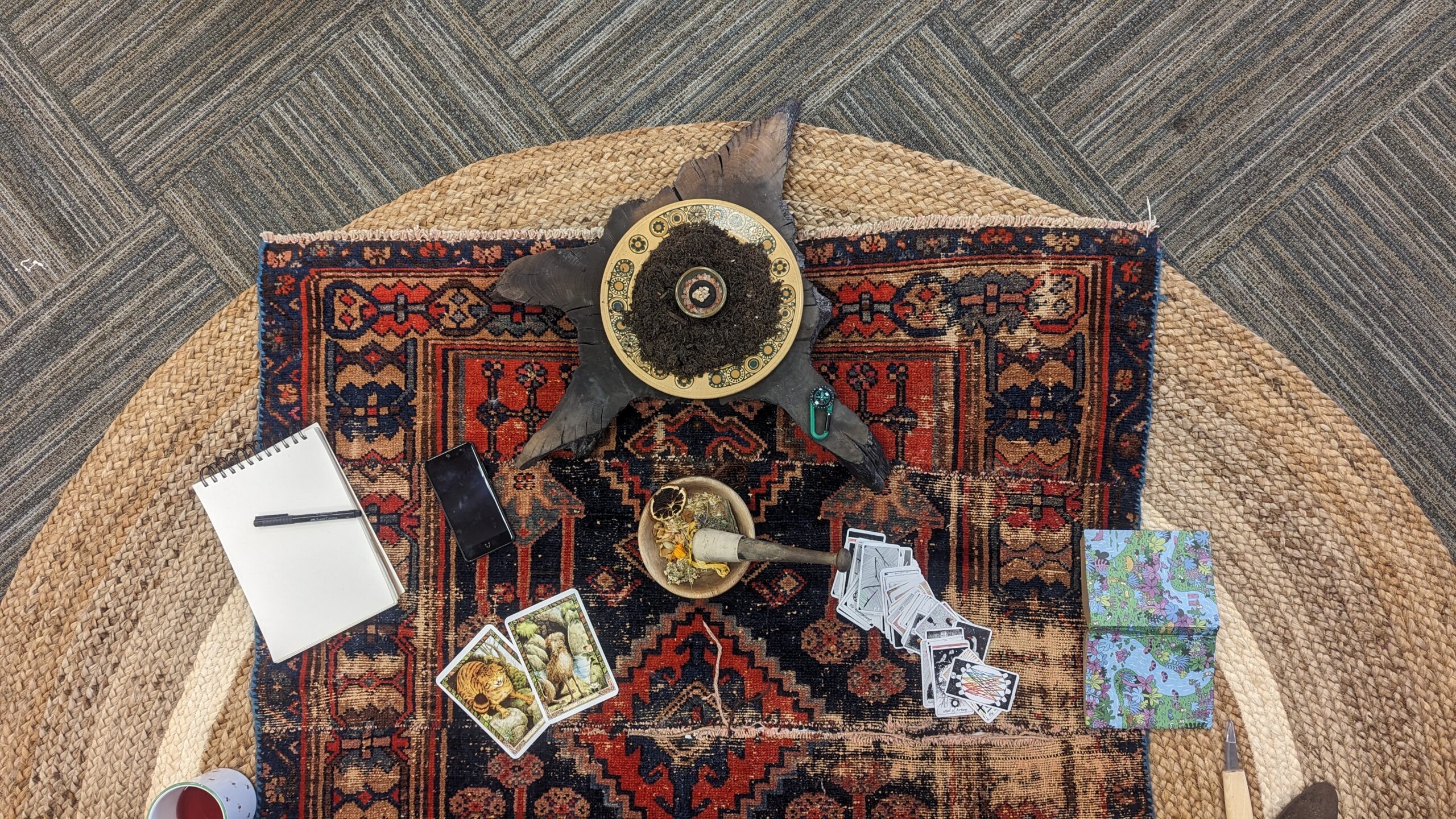 Attempting to learn heritage craft. Learning from a local spiritual group and attending local Moots to learn more. Thinking about the ritual/ceremony present in the making of my work – in the placing of some collaborative works I’ve mentally explored ways of ‘marking’ that moment. Considering performance pieces based in ritual and ceremony – ideas around activating the Ritual Mat piece. Also ongoing tarot and meditation practice. |