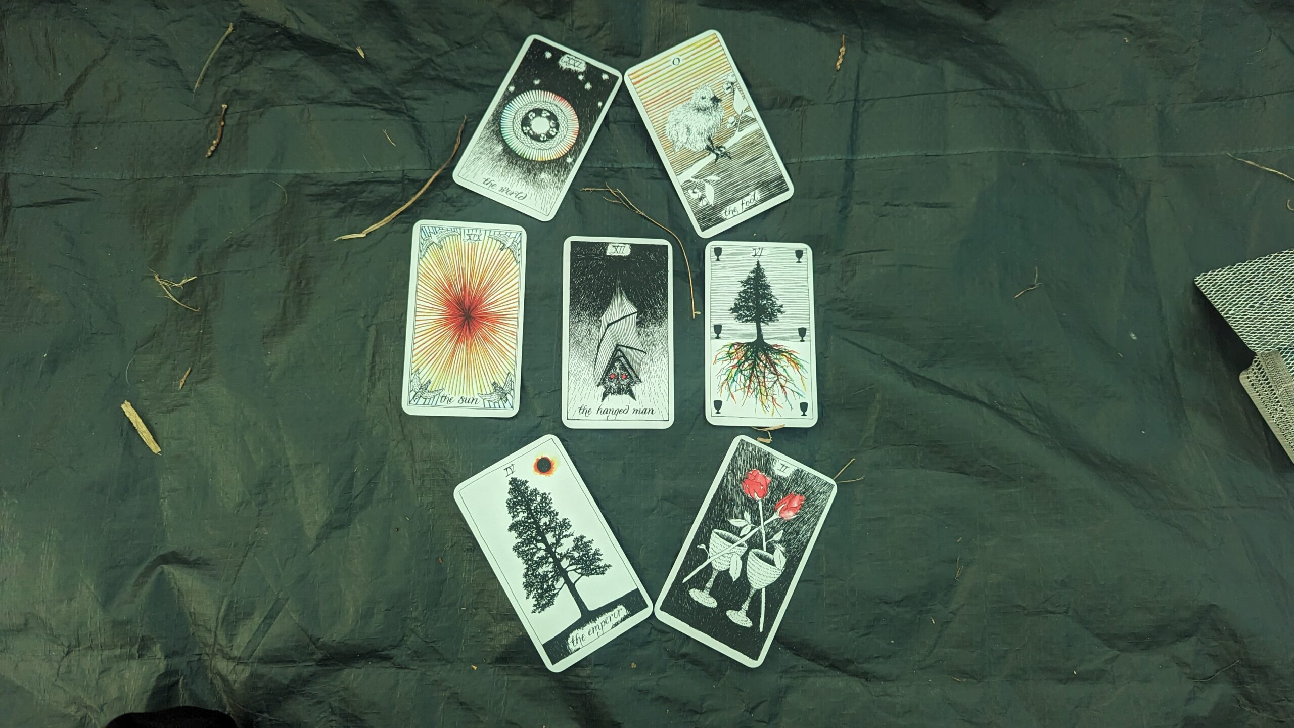 | Acknowledging that Anthropocentric critique favours Global Northern perspectives (DeLoughrey, 2019), the nature-based Reclaiming tradition of paganism criticizes and implicates the mechanistic approach of modern science with oppression, environmental destruction and colonialism. They reject the disconnection of materiality and spirit, and respond by identifying with the knowledge dismissed by religion and science (Morgain, 2013). | Tarot, meditation, making with natural materials whilst keeping magical associations in mind (e.g. ritual mat, Bergonia Storm work, choice of seeds in the seed ball), cleansing the exhibition space before each opening up, investigating ritual and magick, mentally reframing the processes of being and making with nature as ritual. |