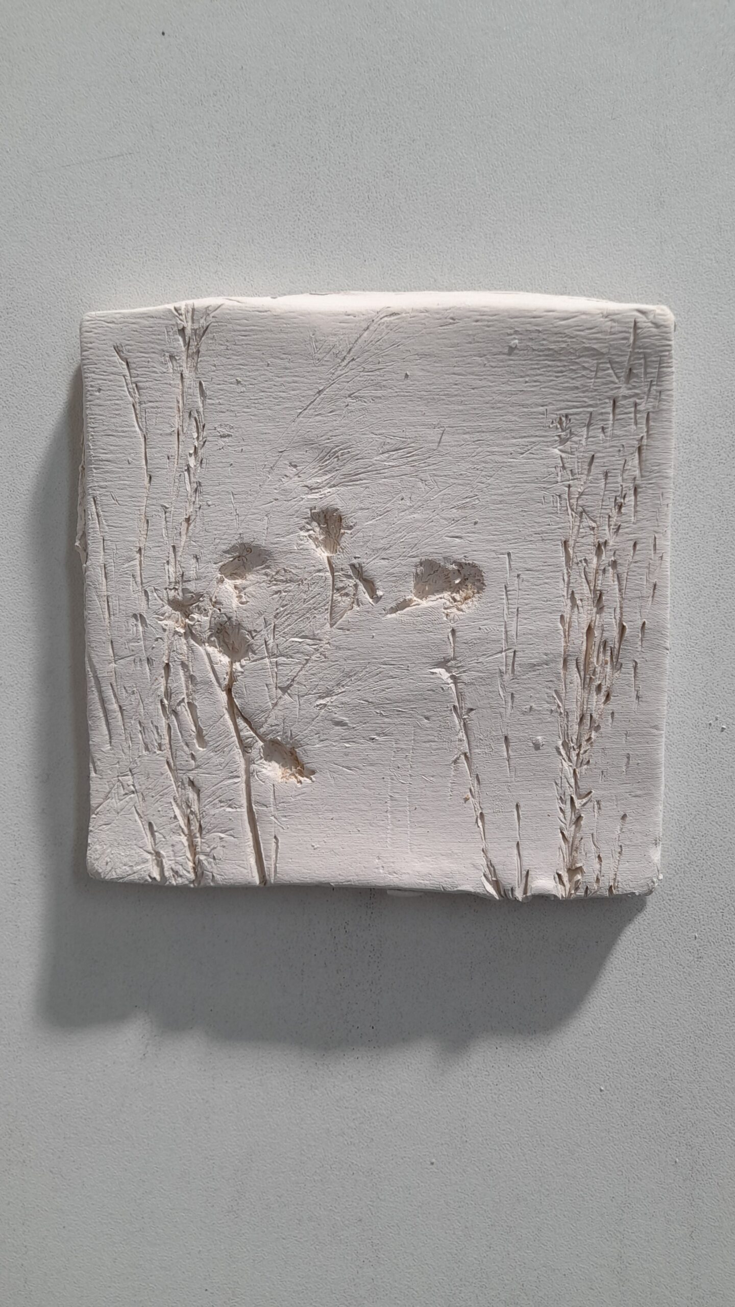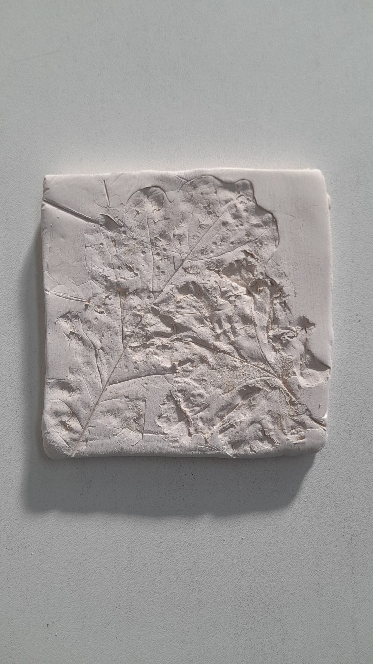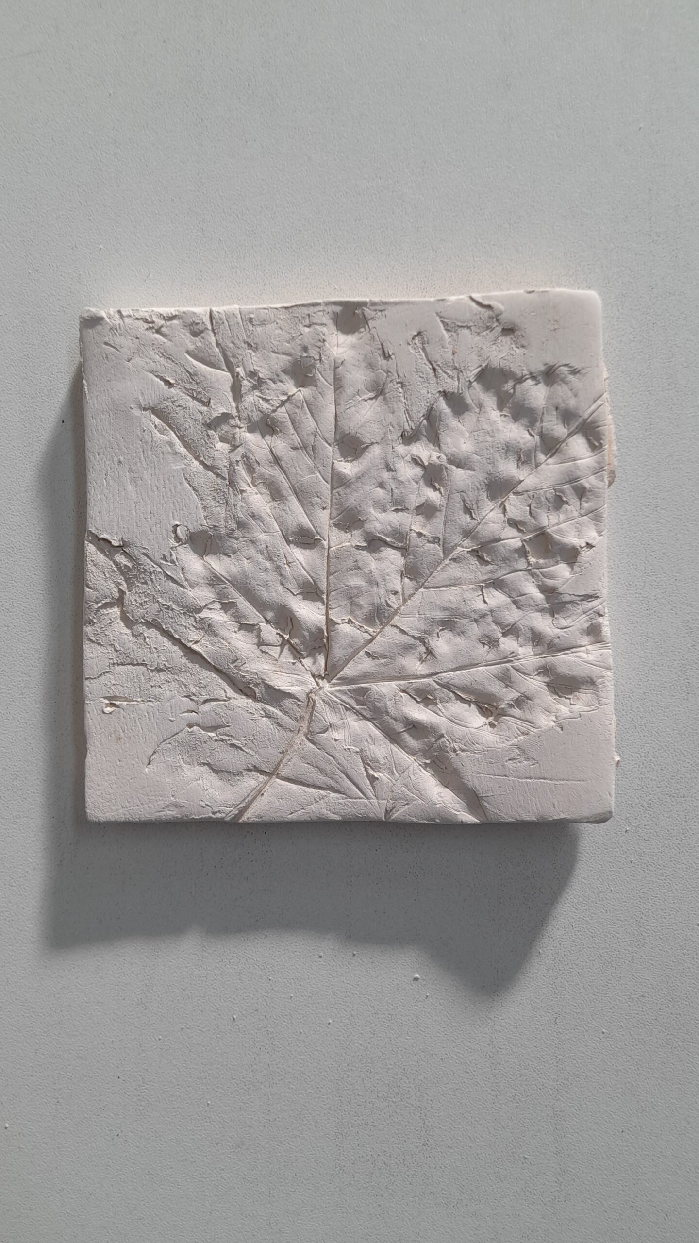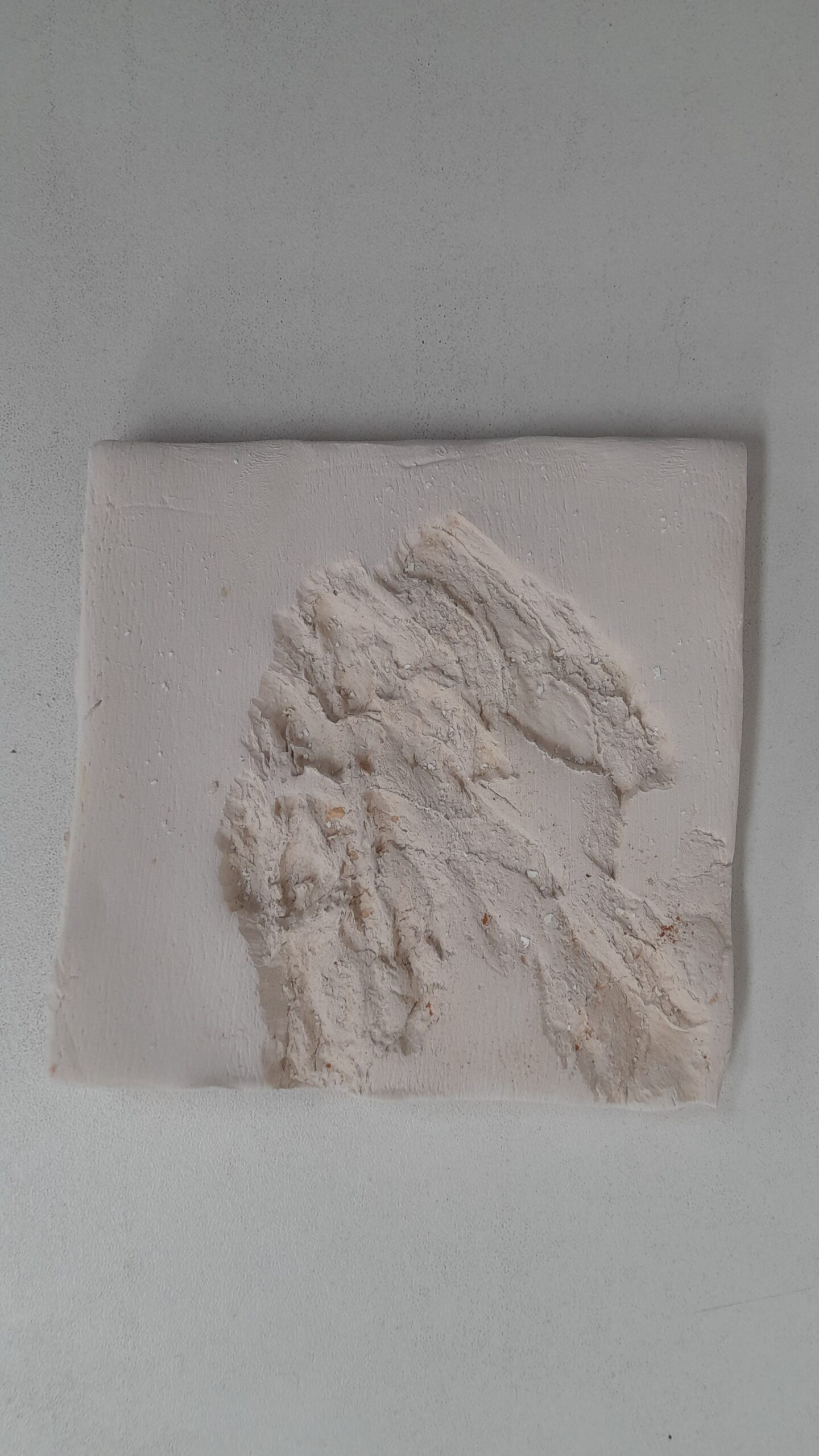 Anyway, I chose early on to not glaze/colour my pieces, and leave some pieces unfired (for comparison), because I wanted the clay to be porous and susceptible to other non-human collaborators (rain, soil, bugs, whatever). I made some small pots (pinch pots and thrown pots), 10 tiles, a mini figure of my dog, a big solid sphere, and some other bits and bobs. I pressed naturally found objects into the tiles to leave an imprint, which was simple but quite effective. I really appreciate the textures. I also made a small clay ball which I intended to leave out on the apartment balcony to let the rain get at it (pictured above in the metal frame thing)… but my dog (who was with me) stole it and ate half of it. I was pissed for a split-second before realising it was a HNHCC! So I had it fired and it’s one of my most unassuming favourite pieces lol.