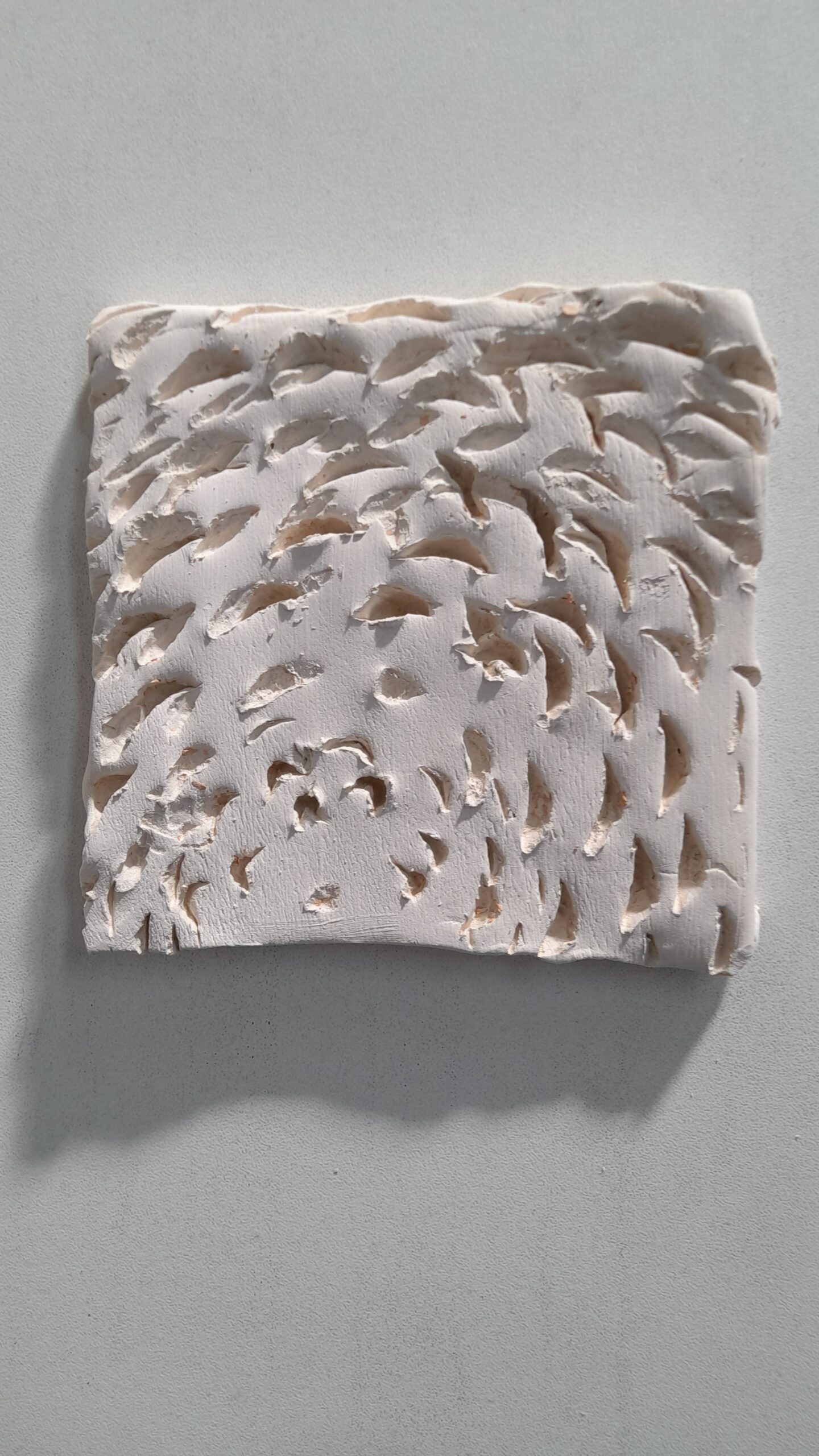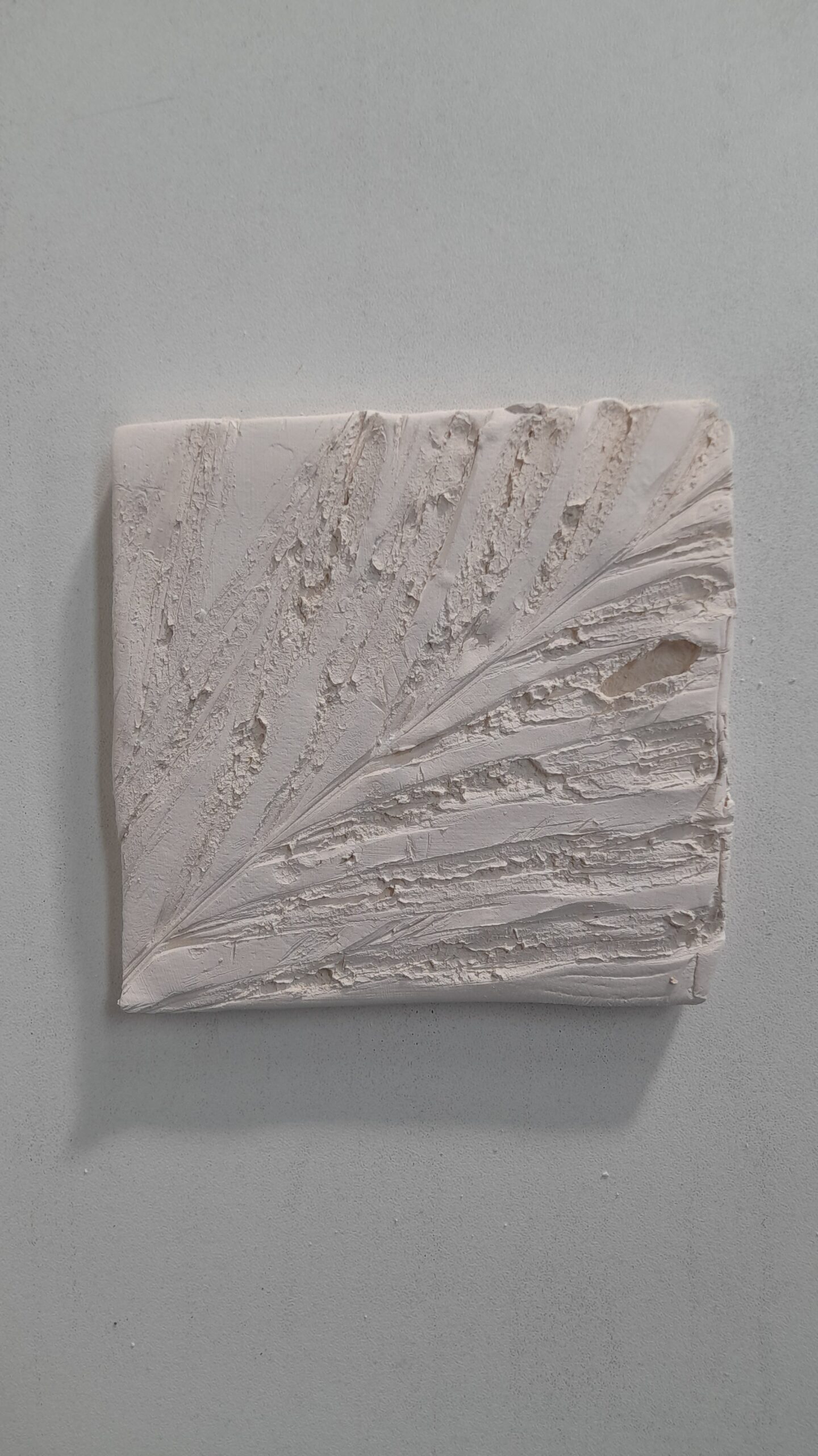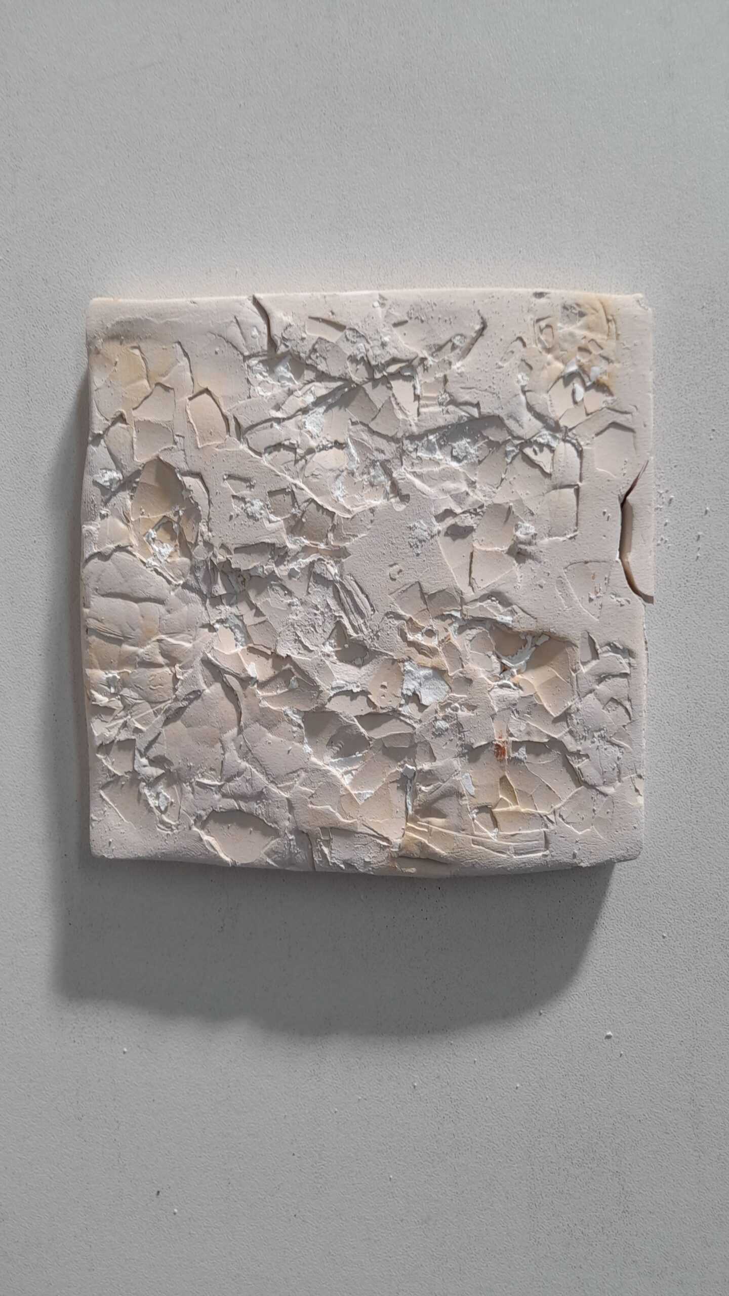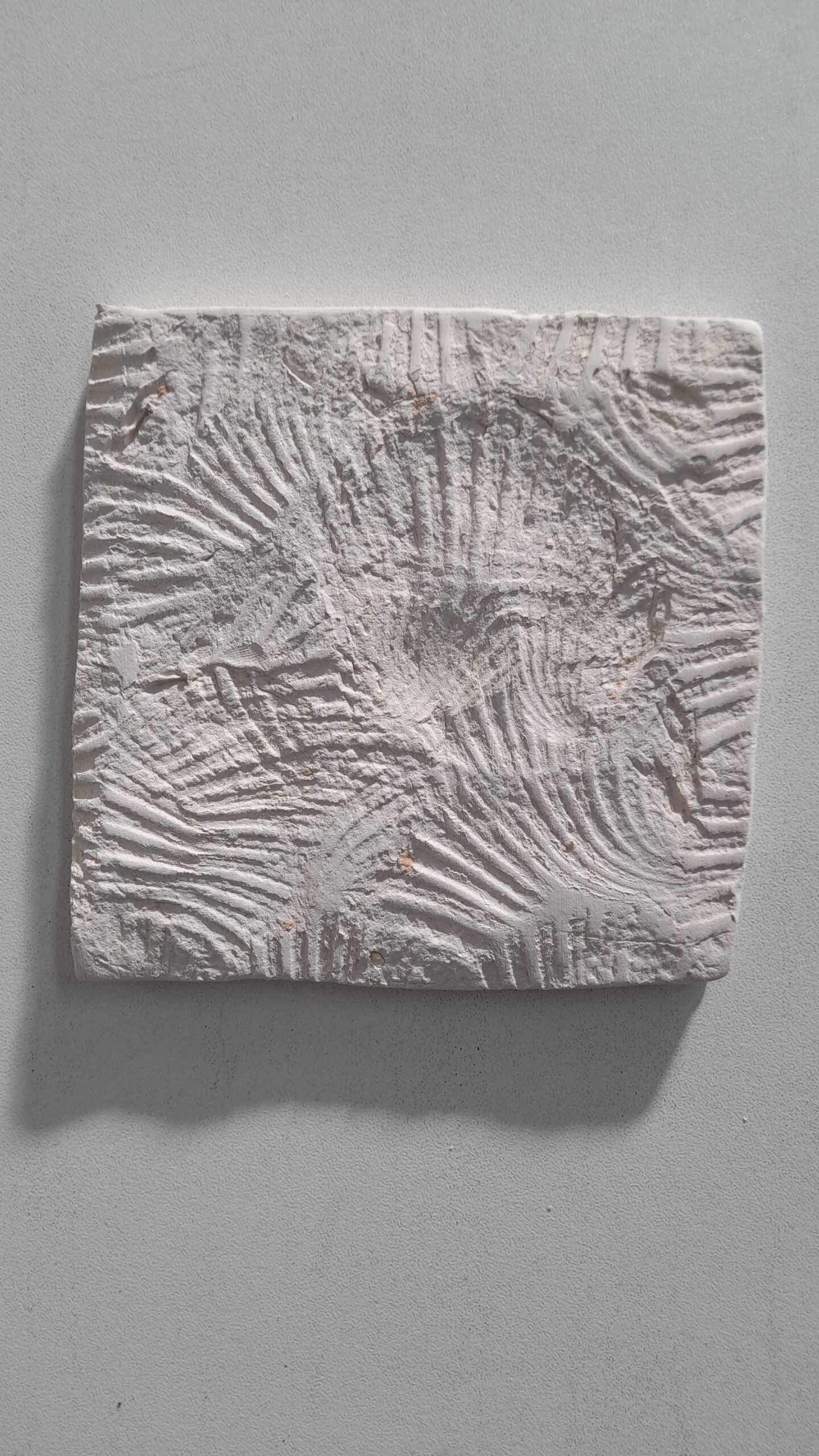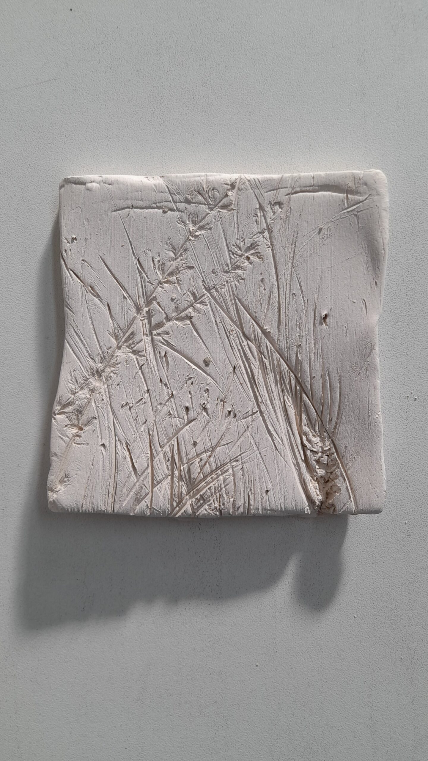 Anyway, I chose early on to not glaze/colour my pieces, and leave some pieces unfired (for comparison), because I wanted the clay to be porous and susceptible to other non-human collaborators (rain, soil, bugs, whatever). I made some small pots (pinch pots and thrown pots), 10 tiles, a mini figure of my dog, a big solid sphere, and some other bits and bobs. I pressed naturally found objects into the tiles to leave an imprint, which was simple but quite effective. I really appreciate the textures. I also made a small clay ball which I intended to leave out on the apartment balcony to let the rain get at it (pictured above in the metal frame thing)… but my dog (who was with me) stole it and ate half of it. I was pissed for a split-second before realising it was a HNHCC! So I had it fired and it’s one of my most unassuming favourite pieces lol.