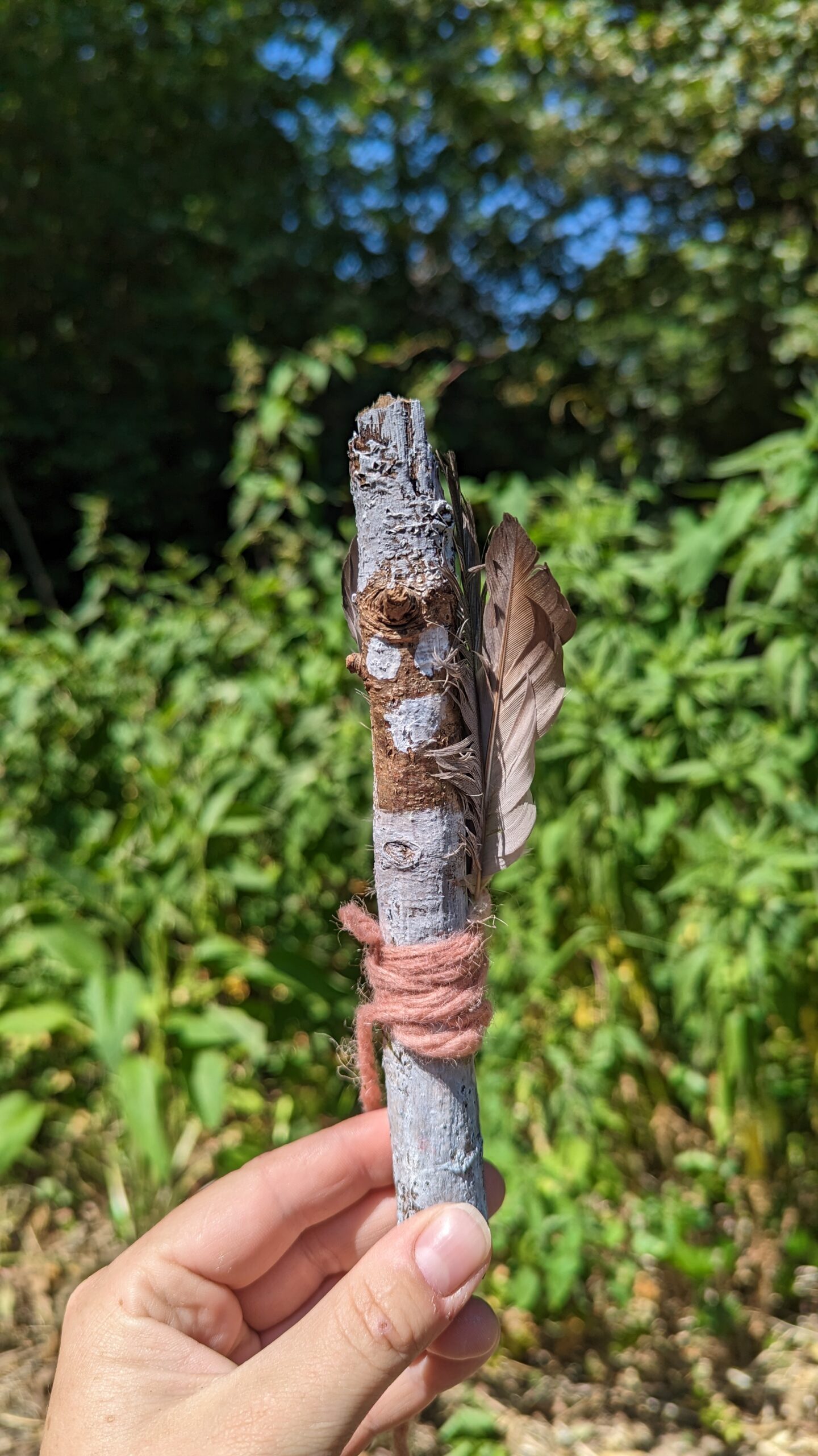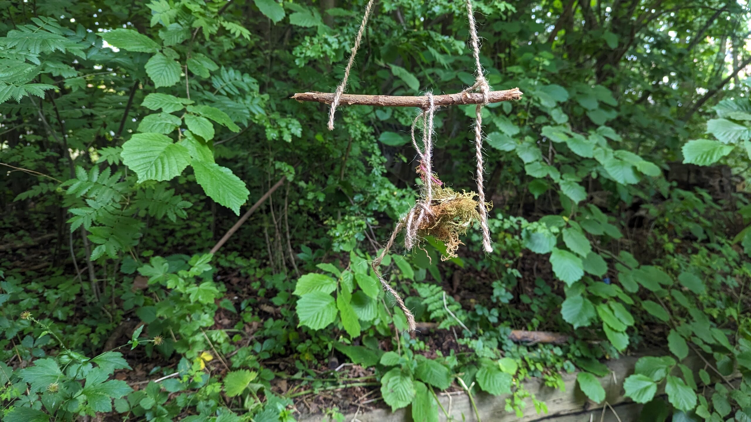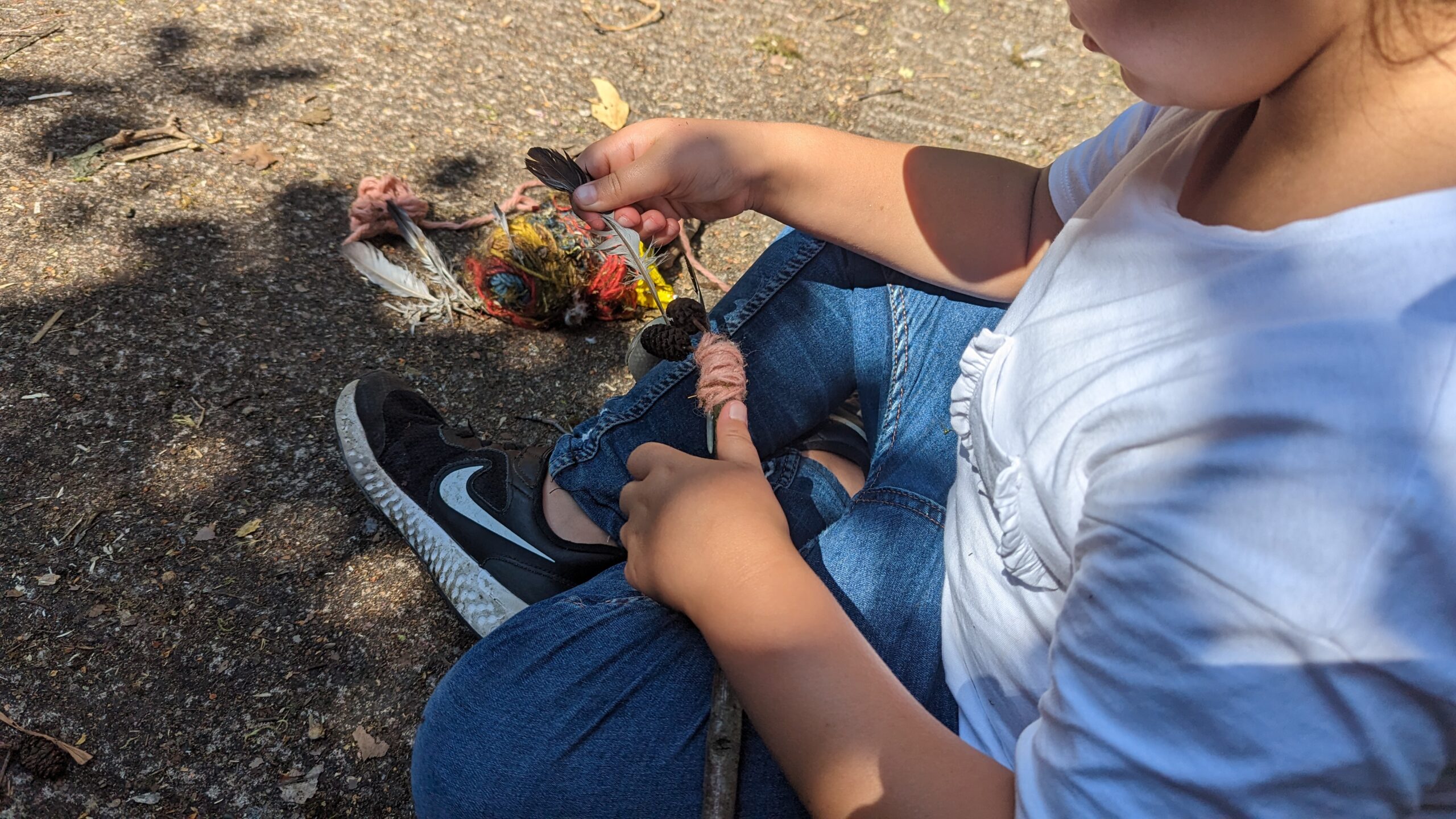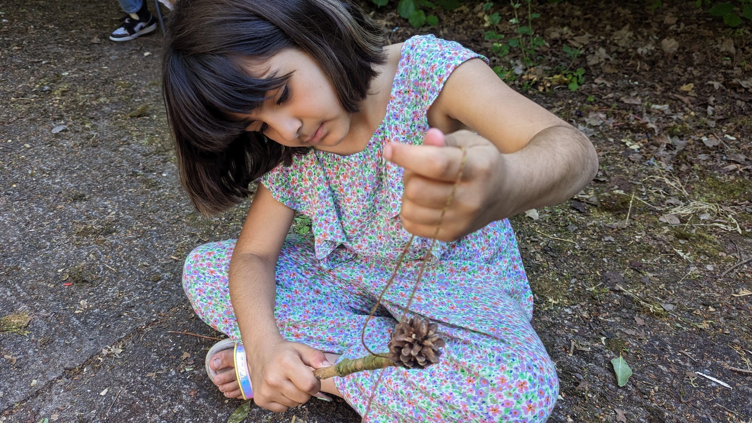 Over six sessions, the children were encouraged to explore and ‘get to know’ the site, connecting to and imagining what Beings could be living in a place like this. We discussed what was meant by the climate crisis and how they felt about it. And together we made plans about what things we could make to put in the den (a willow-and-tree woven ‘cave’ where the Beings supposedly live) to empower them, care for them, make them feel safer, or that might help facilitate human:non-human relationships… before making them from twine and natural materials found on site.